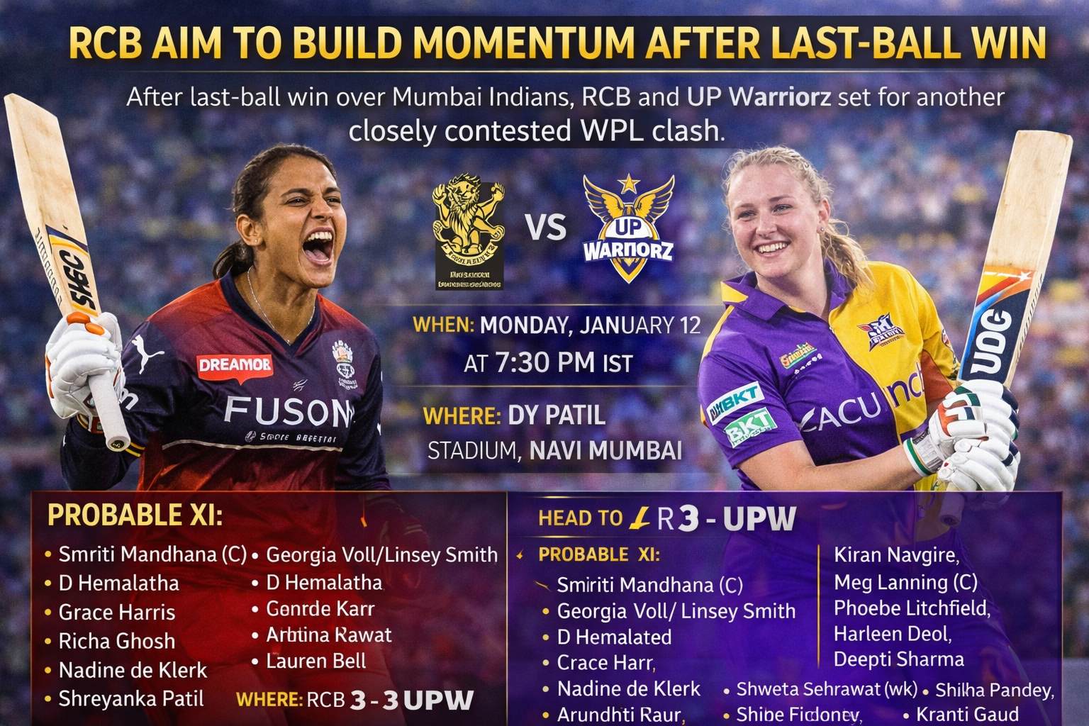 After a nail-biting win to open their campaign, Royal Challengers Bengaluru will look to build momentum when they take on UP Warriorz in what has become one of the most evenly matched rivalries in the WPL (see head-to-head below).