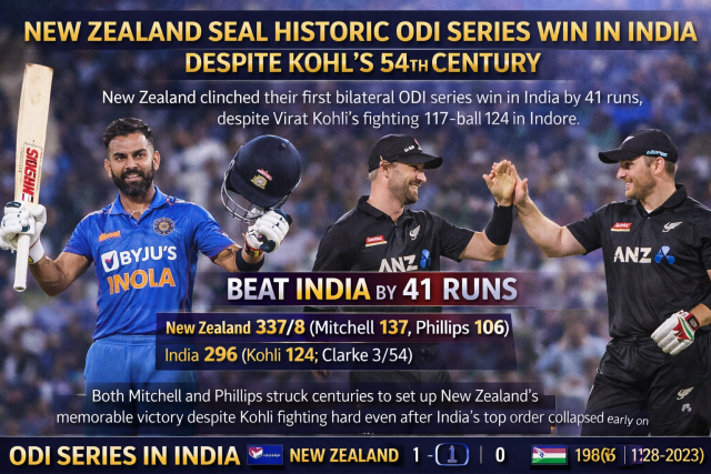 A valiant 54th ODI century from Virat Kohli ultimately proved insufficient as New Zealand scripted history in Indore, sealing their first-ever bilateral ODI series win on Indian soil with a commanding all-round display. Another masterful hundred from Daryl Mitchell, followed by Glenn Phillips’ second ODI ton, powered the visitors to a daunting total. Despite Kohli dragging the chase deep with support from Nitish Reddy and Harshit Rana, India fell short by 41 runs, reports Live Cricket Score.